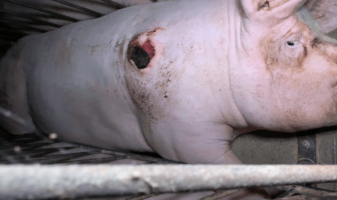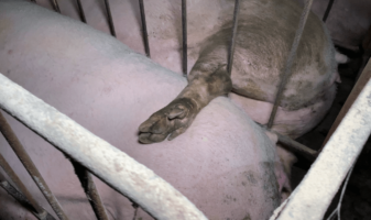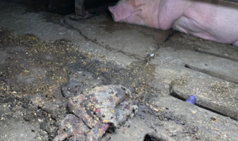 In one of the cramped, restrictive farrowing crates, which prevent mother pigs from turning around, one live piglet was tightly pinned against the bars of the crate, maimed and dangling. Dead piglets were left to lie among the living.