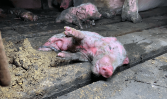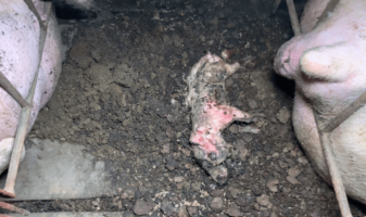 The video shows piglets slowly dying in crates, out of reach of their distraught mothers, while the bodies of others rot just a few feet away.