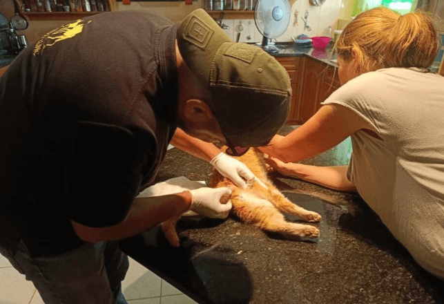 A volunteer brought a limping cat to the clinic and staff found an open wound on his leg. They stitched it up and gave him antibiotics and painkillers. The volunteer is keeping an eye on him as he heals.